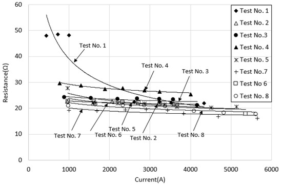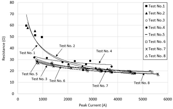 Impulse resistance values were measured as the ratio of the voltage at current peak to the current peak, and plotted versus the peak current, as shown in Figure 16 and Figure 17 for configurations 1 and 2, respectively. The resistance values obtained from these tests were found to decrease with current magnitude, indicating the effect of impulse currents on the characteristics of test electrodes for configurations 1 and 2. It was noted that the impulse resistance are lower a few months after installation, showing improvement in the grounding systems for both configurations. In order to determine the effectiveness of the test electrodes in comparison to its RDC, the percentage of reduction of impulse resistance from its corresponding RDC was measured as (1), where the Rimpulse was taken as the average impulse resistance measured from varying the charging voltage of 30 kV until 210 kV: