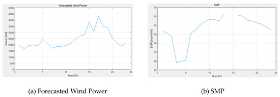 Figure 2 shows common SMP data and wind power forecast data. Grid-connected ESS, in conjunction with wind power generators, gives priority to the economics of ESS providers. In the present system, the simulation time step is one hour because the charge is settled in 1-hour. In addition, even when the REC weighting is in operation, the discharge amount is set to the amount of time. The predicted value of the wind power generation was applied based on the average wind speed per hour, and it was assumed that the actual system operation was controlled so that the real time measurement value was not exceeded the value multiplied by . Additionally, in the FR operation mode, the FR was measured by measuring the frequency in real time, and it was assumed that the SOC was recovered at the end of the FR operation mode as previously assumed.