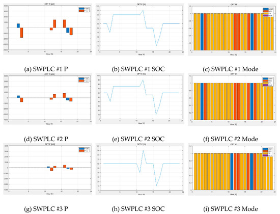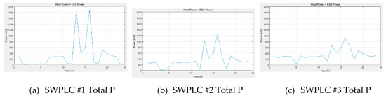 Figure 6 is the simulation result of Scenario 3. Figure 6 shows that the output and output mode graphs for each SWPLC show more charging instructions in REC mode than in previous scenarios. Earlier, it was assumed that three wind turbines were rated at 3 MW and were associated with one SWPLC. Thus, in the previous scenario, the forecast wind power of about 2 MW/hour could be charged for an hour with enough capacity, compared to the forecast wind power of about 1 hour, requires a lot of time for sufficient capacity. Therefore, many REC output modes are required at 1 C-rate SWPLC with a higher rated capacity, and many REC output modes are not required because the higher the C-rate. C-rate is generally the ratio of the output to the rated capacity of the ESS. Figure 7 shows an output graph of wind power generation by SWPLC combined with ESS. As shown in Figure 6a and Figure 7a, the SWPLC at the 1 C-rate has a lot of capacity required for revenue from expensive REC operations, indicating that the charge is high at dawn. In Figure 7a, considering , it can be seen that almost all wind power is charged from ESS. By comparison, in Figure 7b,c, you can see that the charge is less time than SWPCL #1. However, SWPLC #2, #3 can be found to be involved in frequency regulation after charging for a small amount of time due to low demand capacity. Thus, if the rated capacity of wind farms versus ESS is higher, the ESS with high C-rate is expected to operate similar to other days when low wind speeds are expected, while the ESS with low C-rate is likely to charge wind power for a long time. After discharge for REC weights after 12 p.m., the charging schedule is set for the constraints , . Additionally, as with earlier charging, the 1C-rate SWPLC can be seen to require a lot of time to discharge.