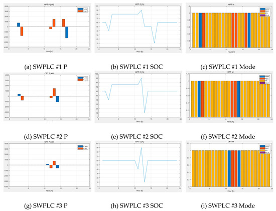 Figure 3 shows the simulation results of Scenario 1. This figure shows the power, SOC, and operation mode for each SWPLC. In the output graph, the blue bar means output by ARBT and the red bar means output by REC. In the graph of the time mode operation mode, the blue bar indicates the ARBT, the red bar indicates REC, the yellow bar indicates FR, and the purple bar indicates an idle state. In the output graph, the frequency regulation service participation capacity is not expressed as output, because it is assumed that it can participate at the maximum capacity. Comparing Figure 3 (a), (d), (g), it can be seen that no discharge occurs at dawn at SWPLC #3 with high C-rate. This means that the REC weighting time in summer is 1–3 p.m. and that REC * w can be expected in SMP. Therefore, it is necessary to charge the SOC2 so that it discharges as much as the that was charged with the initial ARBT and discharges to the REC. Therefore, it can be confirmed that the large capacity SWPLC 1 and 2 are discharged before 4 or 5 a.m. when the SMP is low, and charged to by the maximum SOC for participating in the frequency regulation. After that, it can be confirmed that SOC is discharged up to 90% immediately before 1 p.m. and to SOC 10% between 1 p.m. and 3 p.m. after charging. In contrast, the third SWPLC with a low capacity has a small SOC range for participating in the frequency regulation service, and the amount of charge required to discharge the maximum is smaller than the rated value of the wind turbine generator. After 11–12 a.m., it discharges to and charges between and 12–13 a.m. to secure capacity. After the REC weighting time period, it is confirmed that the ARBT charges the constraint 20% REC constraint SOC 30% as in the case of the initial constraint.