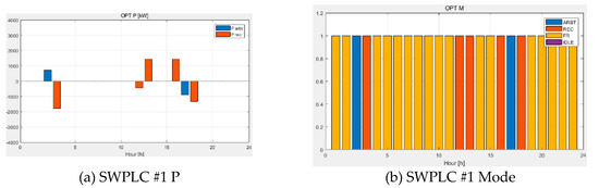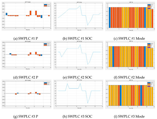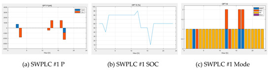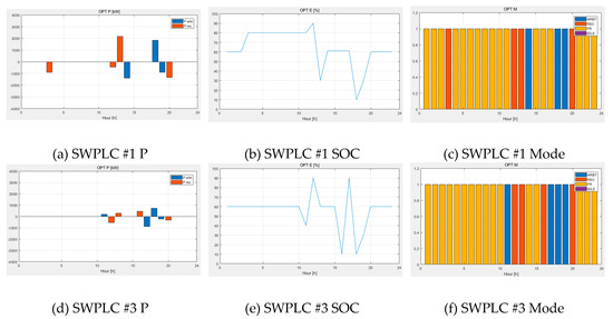 Figure 10 shows the simulation results of Scenario 5. In contrast to the results of Scenario 1, Figure 10a shows that there are two outputs at the same time for one hour to recover the final SOC. In Figure 10 (c), two additional clocks are active at the same time, but the actual output is 0 and only the discharge by REC is active. Other than that, the simulation result of Scenario 1 is the same as the result of simulation of SWCLC # 1, except for the part for the final SOC recovery.