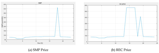 In Equation (1), is the ESS output of th mode and is the price of the th mode. In this system, the first mode is the energy arbitrage mode (ARBT) and is hourly SMP. The second mode is the REC-weighted operation (REC) and is the addition of the hourly SMP and REC value. The third mode is frequency regulation mode (FR) and is the unit price for participating capacity of the frequency regulation service.