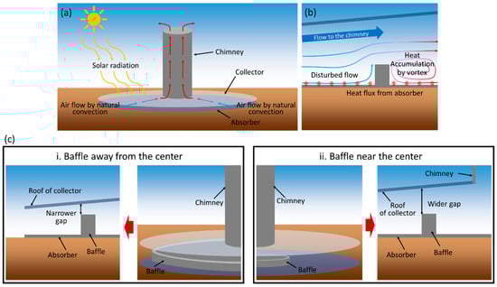 A schematic of the effects by baffle distance from the center in a solar updraft tower (SUT): (a) The overall view of the SUT showing each component and the basic principles of the SUT. (b) Two major effects of baffle in the SUT: disturbed flow and heat accumulation by vortex. (c) A comparison of the effects in terms of the baffle distance: (i) the case where the baffle is far from the center and (ii) the case where baffle is near the center.