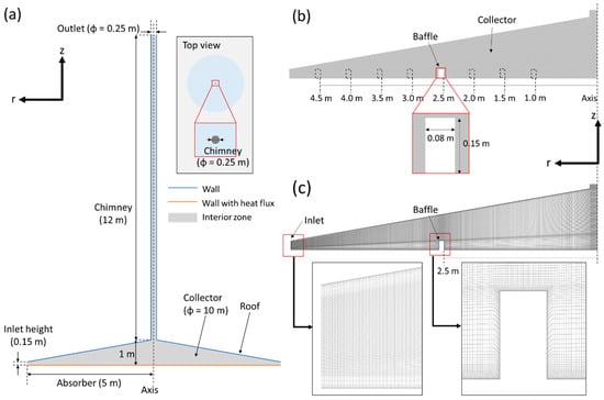 The geometry of the SUT analyzed in this study is basically the same as two previous studies of the SUT with the baffle mentioned above [,]. The total height of the SUT is 13 m, the chimney height is 12 m, the collector diameter is 10 m, the inlet of the collector has a height of 0.15 m, and the chimney diameter is 0.25 m (Figure 2a). We used 2-D axisymmetric models with the axis set to the center of the SUT. The dimensions of the baffle were 0.08 m wide and 0.15 m high (Figure 2b). For the numerical analysis, a quadrilateral grid was applied and the grid density near the walls and baffles was made higher for an accurate analysis (Figure 2c). After performing grid tests, 123,720 grids were assigned for the models without baffle and approximately 130,000 grids were used for the models with a baffle, taking into account both the accuracy and the efficiency of analysis.