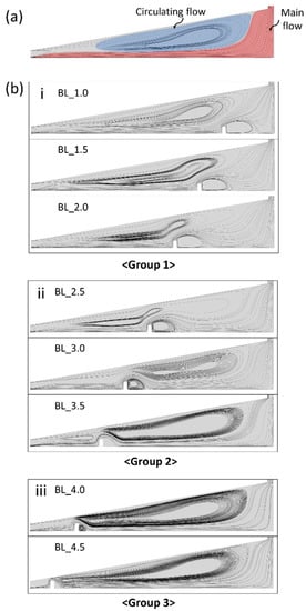 The internal flow field of SUT models with different baffle distances from the center: (a) A streamline of the SUT without a baffle, with a flow field classified as “circulating flow” for the circulation streamline and “main flow” for the streamline to the chimney. (b) The classification of models with a baffle based on the change of the “circulating flow”: (i) Group 1 includes the “BL_1.0”, “BL_1.5”, and “BL_2.0” models, and its representative model is “BL_1.0”; (ii) Group 2 includes the “BL_2.5”, “BL_3.0”, and “BL_3.5” models, and its representative model is “BL_2.5”; and (iii) Group 3 includes the “BL_4.0”, and “BL_4.5” models, and its representative model is “BL_4.0”.
