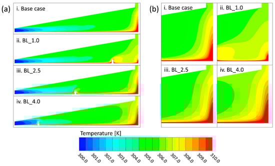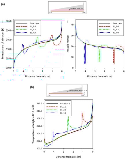 Such changes in the flow pattern also lead to temperature distribution changes in each model. To confirm this, we examined the temperature profiles at some specific locations. Note that we selected BL_1.0 for Group 1, BL_2.5 for Group 2, and BL_4.0 for Group 3 as the representative model cases of each group). First, the temperature profiles of the absorber surface (h = 0 m) of the represented models showed a rapid rise around the baffle and a relatively low temperature just behind the baffle (Figure 4(ai)). This was due to the vortex formed in the main flow at the rear of the baffle. In the model without a baffle (the base case), it was observed that the temperature “gradually” increased as the temperature approached the chimney without any fluctuation. This was because the flow that acted as a heat transfer medium in the base case proceeded without any hindrance that caused abrupt changes (Figure 3a). On the other hand, in the models with baffles, a vortex was formed behind the baffle, delaying the overall flow of the collector (Figure 3b) and enhancing the heat transfer inside the vortex. This is explained more clearly by the Nusselt number (the ratio of convection heat transfer to conduction heat transfer on the surface of an object), which is relatively higher as the flow passes over the baffle (Figure 4(aii)). It also implied that the vortex behind each baffle carried away the locally heated air, resulting in a higher convective heat transfer rate and a higher Nusselt number. Contrarily, the Nusselt number graph before each baffle was meaningfully low because the flow was stagnated by the baffle structure, minimizing the convective heat transfer. Also, as the baffle approached the center of the collector, the temperature rise at the baffle position tended to be even higher. The temperature profile of the tip height (h = 0.15 m) of the baffle was a position slightly away from the absorber where the heat flux was generated (where the heat exchange of the main flow and the circulation flow was more advanced). The temperature distribution in this area showed the influence of the flow, depending on the baffle position on the temperature distribution in the collector (Figure 4b). In all cases, the temperature downstream of the baffle was generally higher than the temperature upstream. This tendency was more apparent when the baffle was located closer to the collector inlet. In other words, the temperatures upstream and downstream of the baffle had a larger gap. This shows that the baffle prevented the heat in the downstream space from flowing out upstream of the baffle and that the function of this baffle was more effective when the baffle was closer to the collector inlet. The extent to which the internal heat flows out could be seen through the temperature distribution at the inlet of the SUT is shown in Figure 5a. The inlet injects air mainly from the outside, but due to the action of circulation flow, some air may leak out to the outside. The flow from the bottom (absorber) of the inlet to a height of approximately 0.094 m inflows to the collector, and the flow above a height of approximately 0.094 m is an outflow from collector to the outside. This can be seen from the radial velocity profile of the inlet with the x-axis set to height (Figure 5b). The high temperature of this outflow relative to ambient air (300 K) means that the outflow effuses the internal heat from the absorber. Therefore, the outlet temperature is, preferably, as low as possible to preserve the internal heat, and the closer the baffle is to the collector inlet, the lower this temperature is. The effect of this baffle affects the temperature distribution of the entire SUT as well as the temperature distribution of the specific location. First, the temperature contour of the representative models of each group (BL_1.0 of Group 1, BL_2.5 of Group 2, and BL_4.0 of Group 3) shows that the temperature is generally high at BL_4.0, where the baffle is located far from the center. In addition, the temperature of BL_2.5 and BL_1.0, where the distance gradually decreases (Figure 6a), decreases in order. This tendency of the temperature to change is also observed near the central axis where the “main flow” rises through the chimney (Figure 6b). This is an important position where the ascending “main flow” is located, and the high temperature at the center means that the heat flux generated from the absorber is well preserved in the SUT.