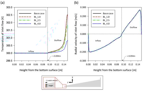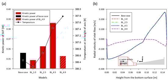 (a) The kinetic power and temperature at the height of 1 m from the center axis (denotes “Base case”, “BL_1.0”, “BL_2.5”, “BL_4.5”, and “BL_4.9”’ for comparison) and (b) the radial velocity profile at the inlet (denotes “Base case”, “BL_1.0”, “BL_2.5”, “BL_4.5”, and “BL_4.9” for comparison).