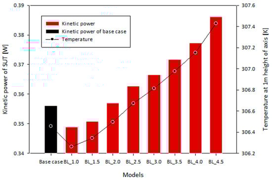 where is the density, which is a constant due to the Boussinesq approximation; Ac,in is the cross section of the chimney; and V is the volume flow through the chimney inlet. Both the kinetic power calculated from this equation and the central axis temperature at a height of 1 m of the chimney inlet have the same tendency to increase as the baffle moves away from the center (Figure 7). Since the central axis at a height of 1 m is the position where the rising air current is generated, the relationship between the temperature and the kinetic power at this point can confirm whether the heat transfer of the SUT affects the performance of the SUT. Since the two values show the same tendency, the temperature distribution of the SUT is an important factor in the performance. The change of the temperature distribution according to the position of the baffle is also an important factor in the performance determination. In the case of BL_1.0 and BL_1.5 (located close to the center), the temperature distribution and kinetic power were lower than those of the baffle-free base case (BL_1.0 had a lower kinetic power by –2.04% and BL_1.5 had a lower kinetic power by –1.5%), and BL_2.0 is also very slightly higher than the base case (a slightly higher kinetic power by 0.22%) (Figure 7). This suggests that changes in heat and flow due to the baffle may not lead to an overall performance improvement of the SUT unless the vortex formation is made at the proper location. As the baffle is located further from the center than the BL_2.0, both the temperature and the kinetic power increase (Figure 7) by 0.97 K (temperature) and 8.43% (kinetic power) for BL_4.5. Therefore, the proper position of the baffle to increase the temperature of the central part by preserving the internal heat increases the kinetic power. As a result, the farther the baffle is from the center, the better the internal heat is preserved, and the rising air current can be actively generated. The efficiency was calculated by using the following equation: