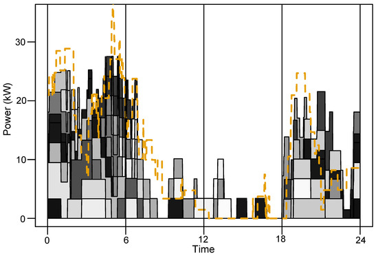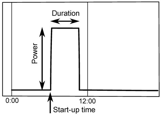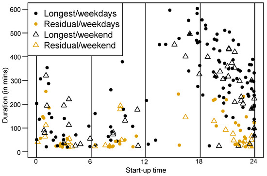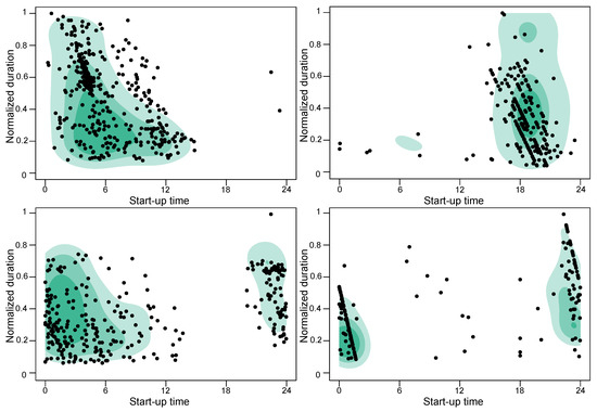- Detecting duration and start-up time. All timestamps were processed in order to list all durations and associated start-up times in the time series. The day of the year on which the charging blocks occurred was also recorded for forecast applications.