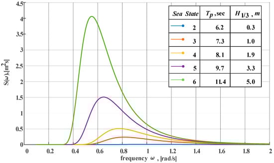 The Bretschneider wave energy spectrum of the sea states 2–6 is depicted in Figure 2. The angular frequency ω of the regular waves is mainly concentrated in the range of 0.5 rad/s to 1.2 rad/s. The irregular time-domain excitation can be obtained from the energy spectrum as,