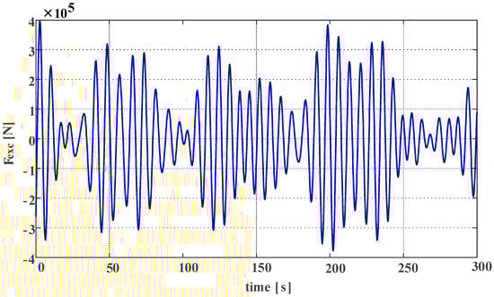 Figure 2 shows the energy spectrum obtained by the selected wave period and a significant wave height of the sea state. It can be seen that the available wave energy range is from 0.5 rad/s to 1.2 rad/s, while the wave energy density of other frequencies is quite small and can be ignored when power control is carried out in the wave power generation system. The time-domain expression of the excitation force on the float can be found [38]. An example of an excitation force curve is shown in Figure 3, with a significant wave height (H1/3 = 1.2 m) and spectrum peak period (Tp = 7.5 s).