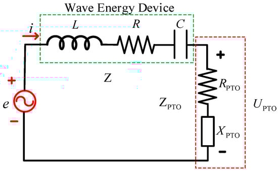 Figure 4 shows the equivalent electric model of the WEC, where the wave excitation force corresponds to the supply voltage e, the velocity of buoy represents the current i, the mass term () stands for the inductance term (L) of the WEC impedance, the spring term (K) coefficient stands for the capacitive (C), and the real component of the radiation damping represents the resistive (R). The force applied by the PTO corresponds to the load voltage of .