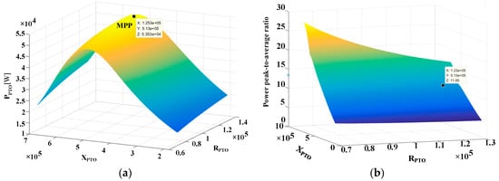 The relationship between the equivalent mechanical impedance of the permanent magnet synchronous motor (i.e., RPTO and XPTO) and the extracted power of the system can be obtained. In Equations (6) and (16), the parameters such as Z, ω, En and Rn are determined by wave period and physical characteristics of the sea state. The maximum average power extracted from the ocean is deduced as follows,