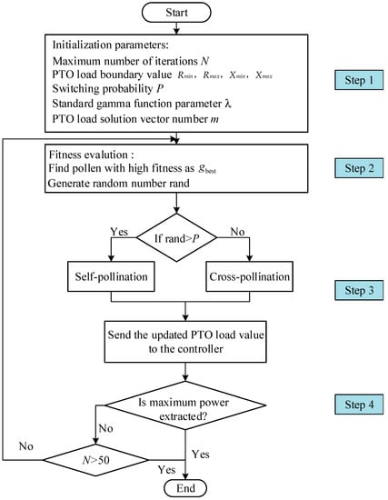 The FPA algorithm is well suited to solve nonlinear optimization problems [34]. In addition, this approach works best for MPPT applications, because it is explored globally and exploits locally in a single iteration. Unlike other bio-inspired algorithms, the best part of this algorithm is that the FPA introduces randomness in each iteration by self-pollination. Thus, the FPA is best suitable for maximum energy extraction of the point-absorbing type WEC. Moreover, this method does not rely on the accuracy of the excitation force and the dominant frequency characteristics of the irregular waves.