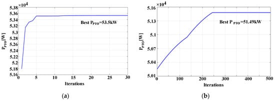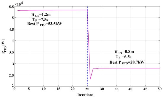 Moreover, the robustness of the proposed technique is further validated, when the sea state suddenly changes as shown in Figure 12. After captured by the wave power generation system repeatedly, the average power can be re-converged to the optimal value. Figure 12 shows the optimal average power search curve for the wave power generation system when Sea condition 1 is changed to Sea condition 3 as listed in Table 1. Among them, the sudden change of the sea state occurs in the 24th iteration, and the system detects the change in the 25th iteration, and then re-searches the optimal power point, indicating that the proposed control method has strong adaptability and immunity.