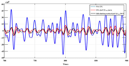 In order to extract the maximum wave energy, in theory, the excitation force should be in phase with the buoy velocity at any incident wave frequency, where the product of the excitation force and the wave speed is exact extracted power. Thus, the WEC operates at resonant conditions, and the wave power generation system extracts the instantaneous maximum power. This performance can be evaluated from Figure 9, where the extreme-seeking control technique based on FPA has better performance in most areas than the hill-climbing method. The reason that the performance of the hill-climbing method is insufficient is mainly due to the slow convergence rate and easy trapping in a local optimum.