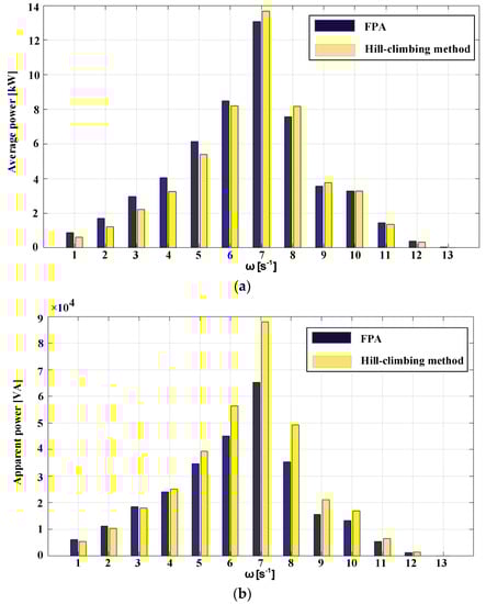 Figure 10 presents the simulated instantaneous power and average power absorption when the wave power generation system operates at maximum energy extraction states. As seen from Figure 10, when the wave power generation system works in the optimal state, in order to maximize the average power, the permanent magnet synchronous motor provides energy at some time, and the energy is transferred from the motor side to the float side. In the rest time, the wave provides energy, which is transferred from the buoy side to the motor side. Compared with the hill-climbing method, the MPPT method based on the FPA can capture more average power and reduces power peak-to-average ratio. The simulated results have proven the advantages of FPA in terms of convergence time, efficiency and accuracy, compared with the hill-climbing method.