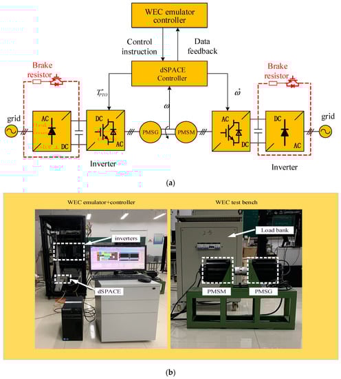 Synchronous test bench, (a) overall control block diagram in the laboratory and (b) experimental setup.