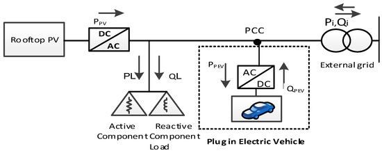 Nevertheless, references [15] and [3,16] have mentioned that though PEVs have the ability to accomplish energy storage functions in the electric network, the degradation of battery storage is still a concern that needs to be considered. Reference [17] mentioned that voltage regulation in contrast to frequency regulation due to frequent charging and discharging of batteries, cannot affect batteries’ lifetime much. These minimal effects motivate the users to profit from providing voltage regulation [11]. Reactive power compensation can support the grid to maintain power quality and reliability and increase the active power transfer limits as well [17]. Reference [18] has shown the V2G reactive support of on-board chargers does not have any consequences on a battery’s life due to the structure of the charger design. Reference [19] has proposed that independent inverters for voltage improvement by using reactive power capability may affect the active power, so the profit of consumers will be decreased. Moreover, references [19,20] show that the control of reactive power in low voltage distribution networks is less effective than in medium and high voltage networks. As a result, considering voltage maintenance in the end node/bus users in distribution networks needs to be investigated [21]. There are limited references such as [22] and [23] that consider the co-operation between PVs and energy storage in unbalanced networks. However, there is not enough information on PEV inverters to reduce and improve the voltage in the unbalanced system which is examined in this research work.