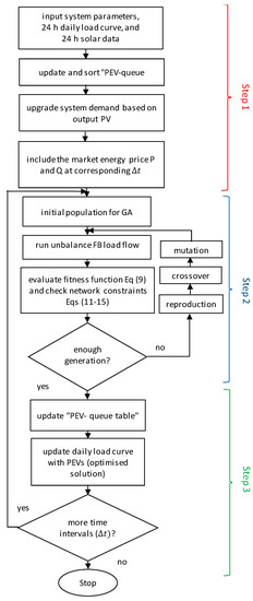In order to solve PEV charging/discharging problem for ancillary voltage support, a GA optimization is selected to simultaneously consider multi-objective functions with several constraints [40]. The flowchart of the proposed online optimal PEV charging/discharging is shown in Figure 2 and consists of the following three steps: