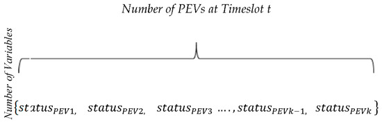 - Based on Step 1, GA optimization is then started: The large random initial population is created to increase the convergence rate to the global solution. Then, the unbalanced load flow is run for each individual evaluated by objective function and grid constraints. Figure 3 shows the configuration of GA chromosomes in this study. As the objective function in this paper is minimizing the total system cost and reducing voltage deviation in unbalance network, the control variables in this optimization are the position (status) of all PEVs. The number “0” displays a PEV has not been charged yet or already finished whereas number “1” indicates the PEVs are being charged. For tracing each PEV’s status including their plugged in and plugged out times, initial and requested SOCs as well as battery sizes, a queue table (Q-table) is generated in Figure 4 After plugging a new , the Q-table will be updated. This is done by performing GA optimization.