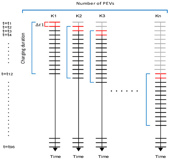 Figure 4 demonstrates the proposed GA optimization schematic for charging/discharging PEVs in unbalanced system during 24 h (96 time slots). t shows the time steps through the optimization based on 15 min while k shows the different number of buses connected to the PEVs. For example in the first time step , t1 shows the optimized time and start time for charging/discharging a PEV connected to bus k1 while t12 displays the finishing time of PEV charging with 3 h charging duration considered in this paper (12 slots).
