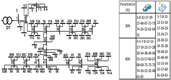 Figure 5 illustrates the three-phase four-wire distribution system studied in this paper. The feeder model is within the Perth solar city high penetration PV trial run by the regional transmission and distribution network services provider of Western Power (Perth, WA, Australia) [32,41]. The 415/240 V network is supplied by a 200 kVA 22 kV/415 V distribution transformer and includes 74 nodes that feed 56 active residential customers. This is a fairly unbalanced network with 11 houses connected to phase A, 11 houses to phase B and 12 houses to phase C in addition to 22 three-phase customers. The network of Figure 5 is also populated with PEVs through the single and three-phase residential feeders. The corresponding net distribution transformer load on phases A, B and C are 63.2%, 70.9% and 76.7%, respectively.