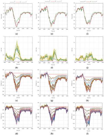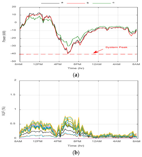 Figure 6a shows the power demand for the unbalanced LV residential feeder with PVs but without any PEVs in different phases (a, b, and c) which are shown in black, red and green, respectively. The residential loads in phases C and B consist of local loads and PV outputs. Nevertheless, only half of the residences on phase C are considered to have PV systems for unbalanced conditions. The import and export demands are presented with negative and positive powers, respectively. Besides, Figure 6b displays the network unbalance where each line displays the VUF profile over 24 h at one of the poles. The peak demand and the maximum VUF of the network are between 5:00 p.m.–7:00 p.m., at −40 kW and 0.8%, respectively. Whereas, the maximum VUF during peak PV generation hours is 0.5936% due to the reverse power flow. The voltages of each phase are revealed in Table 3.