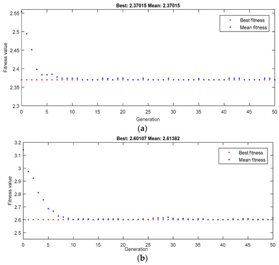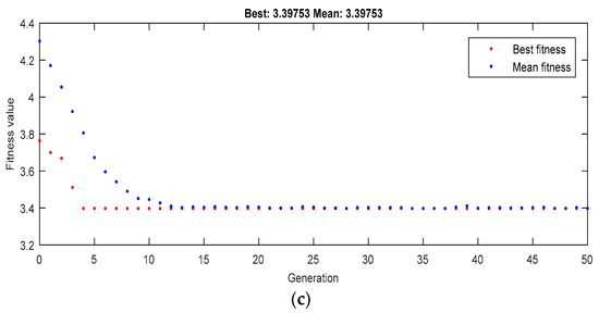 In this case, the PEV inverters are allowed to absorb/inject active and reactive power simultaneously based on the proposed OL-CD-TPQ strategy of Section 2. It means each PEV has an ability to share its capacity to charge P and discharge Q at the same time based on price signals for minimizing the cost operation and further improvement of voltage regulation and more reduction of VUF. According to Table 3, the total cost of charging PEVs and generation is $115.5 per day which consists of four components, i.e., $118.0 for active power generation, $−3.03 per day for reactive generation from PEVs and the rest for losses and VUF penalties. Compared with Case C, it certainly offers a better solution in terms of both grid operation and for consumers with the total payment reduced from $126.9 to $115.5. Furthermore, the voltages at all buses kept within the system limit (Figure 7k,l), the peak power consumption is above the limit (Figure 7i) and VUF have also been reduced (Figure 7j). From Table 3, the maximum VUF is 0.8% at the peak hours and 0.6% in the morning. In comparison with Case C, the maximum VUF and the worst voltage are significantly improved. To show the effectiveness the proposed mothed the convergence characteristic plot of case D for three separate 15 min are presented in Figure 8a–c between 5:15 p.m.–6 p.m. These figures demonstrate the convergence of the best value and mean value of fitness function with maximum 50 generation.
