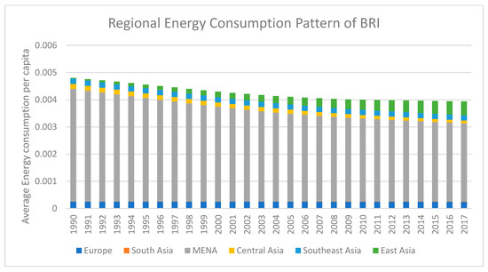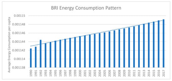China officially used the term the “One Belt and One Road initiative (BRI)” in 2015, containing 65 economies around the globe [1,2]. The National Development and Reform Commission, as well as the Ministries of Commerce, and Foreign Affairs of China publicly announced BRI visions to integrate industrial cooperation containing 65 countries from all over the world [2]. 57 out of 65 of these countries had already signed the articles of agreement of the Asian Infrastructure Investment Bank for official banking service among the BRI region [2]. BRI economies have a 30%, 38.5%, and 62.3% share of global gross domestic product (GDP), land area, and population respectively [1,2,3]. An adequate level of energy is required to achieve the maximum level of output because energy is an essential feature for nurturing all development processes [3,4]. Rapid economic growth leads to an increase in energy use, which has a negative impact on the environment [5]. In the modern world, industrial expansion creates additional demand for energy to fulfil capital intensive growth requirements and modern business operations [3]. According to the World Bank, the world energy consumption increased by nearly 1.43% in 2015, while China was consuming energy at an increased rate of 1.04% [6]. The patterns of energy consumption in BRI are compiled by using the World Development Indicators database [6]. Figure 1 depicts a temporal increasing trend in average energy consumption of the BRI region. The regional energy consumption of BRI economies is presented in Figure 2. It indicates that Europe, South Asia and Southeast Asian economies of BRI have less volatility in their regional energy consumption pattern. MENA economies follow a decreasing energy consumption pattern within the region. East Asia depicts a rapidly increasing energy consumption pattern due to the Chinese economy, as China is the second largest global economy.