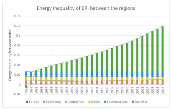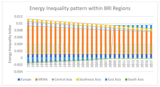 Furthermore, the pattern of average total energy inequality over time, is illustrated in Figure 6. The total energy disparity traces the temporal divergence across the BRI regions due to the higher energy consumption level of China. The minimum average value of total energy inequality is −0.0012 (−0.12 percent), and −0.0076 (−0.76 percent) in Central Asia, and East Asia respectively. There is an uprising temporal tendency in BRI’s total energy inequality. In BRI regions, Central Asia has the lowest total energy inequality while East Asia has the highest total energy inequality due to the higher economy volume and population size of China. Southeast Asia also indicated an increasing trend in total energy inequality over time but this started to decline in 2016, and 2017. Total energy inequality in MENA economies was increasing until 2008 and then followed a declining path. European economies of BRI followed a normal variation in total energy inequality. South Asian economies of BRI experienced an growing trend in total energy inequality due to energy demand and increasing population size, especially in Bangladesh, Pakistan, and India.