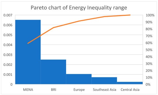 Pareto analysis is also conducted to elaborate the energy inequalities range difference in BRI and its 6 regions. It is illustrated in Figure 4. The MENA region has the highest energy inequality range difference among the BRI regions while BRI itself is the second largest among its regions with respect to energy inequality range. Europe, South Asia, and Central Asia are ranked as 3rd, 4th, and 5th respectively. While, South Asian economies of BRI has the lowest energy inequality index value ranging from “−0.0002864” to “−0.0002587” due to their population growth.