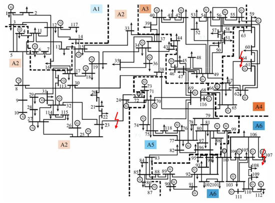 In this section, the proposed method is tested with both the simulated data from the IEEE 118 bus system and real 34-PMU data. The MATPOWER package is used to generate the simulated PMU data [22]. To mimic the normal fluctuations of active load, noise is added so that the signal-to-noise ratio (SNR) is set as 22 dB. In these simulations, three kinds of events, i.e., a short-circuit fault, a disconnection fault, and a generator tripping event, are considered as constituent components of a multiple event, respectively, whereas the magnitudes of bus voltages are used as raw data for analysis. The topology of the IEEE 118 bus system is shown in Figure 1.