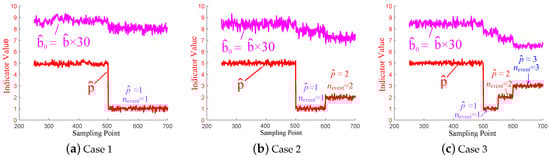 In this set of cases, the simulated data contains 118 voltage measurements with 700 sampling points, respectively. The size of the moving split-window is set as , i.e., . Then, Equation (4) is used in each split-window to estimate the parameters p and b as and : the for the number of the constituent components in a multiple event, and the for the autocorrelation structure of the residuals. The idea behind this is as follows. First, raw voltage magnitude data in each split-window is normalized using Equation (2). Then, we keep subtracting different numbers of factors from the normalized voltage magnitude data using Equation (5) until the residuals become close to the autoregressive model with autoregressive rate b as we calculate in Equation (8). The Jensen-Shannon divergence in Equation (11) is utilized to measure how “close” the two residual spectral distributions are close to each other. The optimal parameter set is finally obtained once the Jensen-Shannon divergence is minimized. Three cases are designed in this part to validate the proposed approach. In Section 4.1.1, Section 4.1.2 and Section 4.1.3, we set different numbers of constituent components in a multiple event, and the corresponding results are shown in Figure 2a–c. The experiments are repeated for 20 times and the results are averaged. We need to point out that the estimation of p and b begins at = 250 due to the length of the split-window. We amplify the value of for thirty times to make it obvious in Figure 2, i.e., .