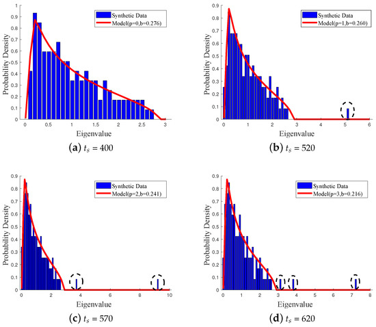 The ESD of the covariance matrix of at different sampling points in Case 3. The bulk can be fitted well by our built model with . The numbers of spikes are different when different numbers of constituent components occurring within a multiple event, which is consistent with the results in Table 5.