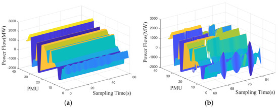 In this section, we evaluate the proposed algorithm with real 34-PMU data. In the following experiment, the real power flow data of a multiple event happened in the China power grids in 2013 is utilized as the raw data for analysis. The PMU number, the sampling rate and the total sampling time are 34, 50 Hz and 284 s, respectively. The multiple event happened from 65.4 s to 73.3 s. Figure 4a,b depict the three-dimensional power flow data under normal conditions and in the case of multiple events. It can be seen that the power flow is relatively steady in the normal state whereas changes irregularly when the multiple event occurs.