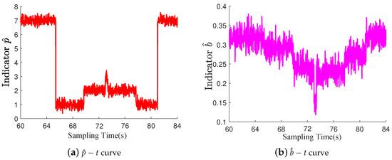 In this experiment, we use a window of size (i.e., ) and move it at each sampling point. In each split-window, we estimate the number of factors and the autoregressive rate of residuals of the power flow data as the synthetic voltage magnitude data we deal with in Section 4.1. Near the occurrence of the multiple event, and are estimated, and the indicators are shown in Figure 5. From the and curves, we can realize multiple event detection and analysis as follows: