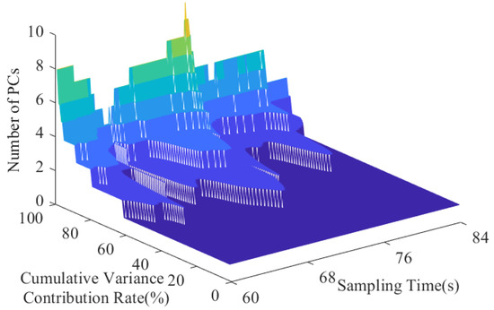 Apparently, the number of PCs is closely related to the predetermined cumulative variance contribution rate . In this experiment, we choose different cumulative variance contribution rates as shown in Figure 6. Real 34-PMU data in Section 4.2 is utilized for analysis. The size of the split-window is set the same as in Section 4.2, i.e., , so that the multiple events are the same in each split-window of the two comparative experiments, and the two methods can be compared directly.