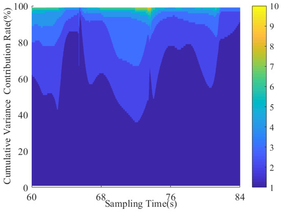 Figure 7 is a top view of Figure 6, and the number of principal components is shown by the color bar on the right side. The two figures indicate that the cumulative variance contribution rate has a significant influence on the number of principal components. The threshold, however, is set empirically in advance. Furthermore, Figure 7 shows that the number of PCs determined by PCA cannot effectively reflect the number of constituent components in the multiple event no matter what cumulative variance contribution rate we choose.