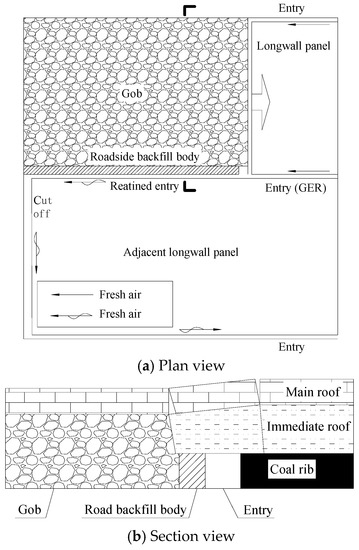 Gob-side entry retaining (GER) was tested and applied in the UK, Germany, Poland, and Russia in the past few decades, while GER is widely applied in coal mining in China [1,2,3,4,5,6,7]. GER is a safe, green and efficient mining technology with advantages including reduced excavation rates, relief of the rapid movement of mining activities, improved coal recovery rates and settling of corner gas accumulation, lowered panel temperatures and optimized working environments [8,9,10,11,12,13,14]. However, GER would restrain the longwall panel advance speed. Figure 1 shows a typical section view of the GER schematic diagram. When the longwall panel advances a certain distance, the RBB will be constructed at a distance away from the active panel. The retained entry will be applied to the adjacent longwall panel. Under this condition, the surrounding rock control of GER would be affected by overburden rock strata movements.