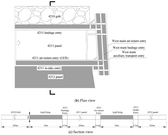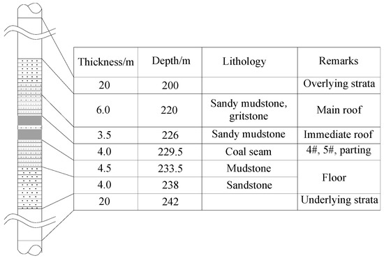 The current case study was based of the mining and geological conditions of the 4211 panel in the Liujiazhuang coal mine, Shanxi Province, China. The main #4 and #5 coal seams are 1.7 m and 1.8 m thick. The average thickness of the parting between the #4 and #5 coal seams is 0.5 m, and the parting is mined out coupled with the #4 and #5 coal seams. The average dip angle of the #4 and #5 coal seams is 4 degrees. The rock strata above the #4 and #5 coal seam consist of sandy mudstone (3.5 m thick), sandy mudstone and gritstone interbedding (6.3 m thick). Meanwhile, the floor strata below the #4 and #5 coal seams consist of sandy mudstone (4.5 m thick) and sandstone (7.0 m thick). The generalized stratigraphy of the 4211 panel is shown in Figure 2. The mining height of the 4211 panel is 4.0 m. The width of the 4211 panel is 200 m. The 4211 panel is developed by a three-entry system. All sections of the entries are 4.5 wide by 4.0 m high, which are excavated along the 5# coal seam floor (see Figure 3). The average overburden depth of the 4211 panel is 200 m. The coal pillar width between the 4211 haulage entry and 4211 air-return entry (GER) is 30 m.