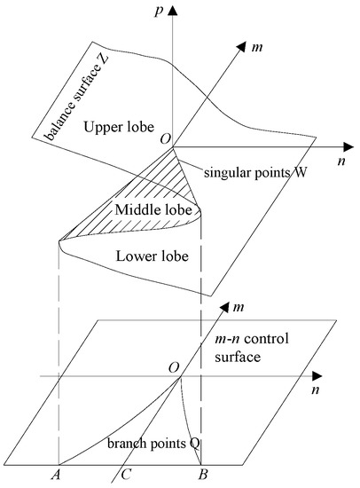 Figure 4 shows the balance surface Z and bifurcation set. All points on the balance surface (p, m, n) are referred to as balance points of the steady state function V. The equation of singular points W can be obtained by the following equation: