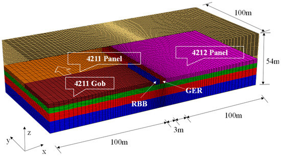 A 3D numerical model was constructed in FLAC3D software based on the 4211 panel mining and geological conditions in the Liujiazhuang coal mine. The model was consisted of part of the 4211 panel (100 m), part of the 4212 panel (100 m), and the entry system between them. The RBB width in the global model is 3.0 m. The dimensions of the model are 207.5 m × 100 m × 54 m (length ×width × height) along the x, y, and z axial direction, as shown in Figure 6. At the top of the model, a vertical load (vertical stress 5 MPa) is applied to simulate the overburden weight. According to the in-situ stress test results [25,26,27], the horizontal stress is equal to the vertical stress. The horizontal and bottom sides are roller constrained. The Mohr–Coulomb model is applied to simulate the rock strata including the RBB. On the basis of the laboratory results for the mechanical properties of rock and RBB, the parameters employed in the model have been determined. Moreover, some trial model tests have been carried out and the mechanical parameters are adjusted in reference to the in-situ measurement on the displacement [7,28,29,30,31]. The final rock strata property parameters in the numerical model are shown in Table 1. The modeling process is as follows: (i) calculating the initial state induced by the gravity; (ii) modeling the excavations of the 4211 air-return entry; (iii) retreating 4211 panel; (iv) modeling the retaining of the 4211 air-return entry with respect to retained entry width (2.5, 3.0, 3.2, 3.5, 3.8, 4.0, 4.5 and 5.0 m).