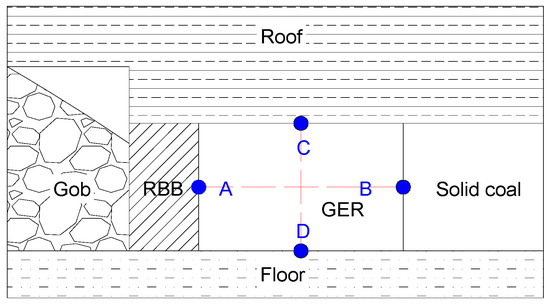 The schematic diagram for GER deformation monitoring is shown in Figure 7. The deformation of the coal rib to the RBB rib can be obtained by measuring the horizontal distance between the A pin and the B pin. The roof to floor deformation can be obtained by measuring the vertical distance between the C pin and D pin.