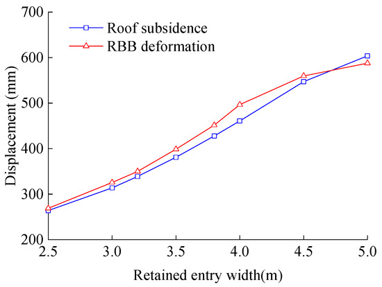 It shows that the retained entry width has a significant impact on roof subsidence and RBB deformation; both the roof subsidence and RBB deformation increase as the retained entry width increases. Meanwhile, Figure 9 presents the increment of surrounding rock deformation for GER.