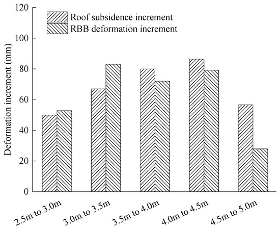 It shows that both the increment of roof subsidence and RBB deformation present a Ʌ-shaped distribution, i.e., there is a critical retained entry width. When the retained entry width is less than the critical value, both the increment of roof subsidence and RBB deformation increase. When the retained entry width is more than the critical value, both the increment of roof subsidence and RBB deformation decrease.