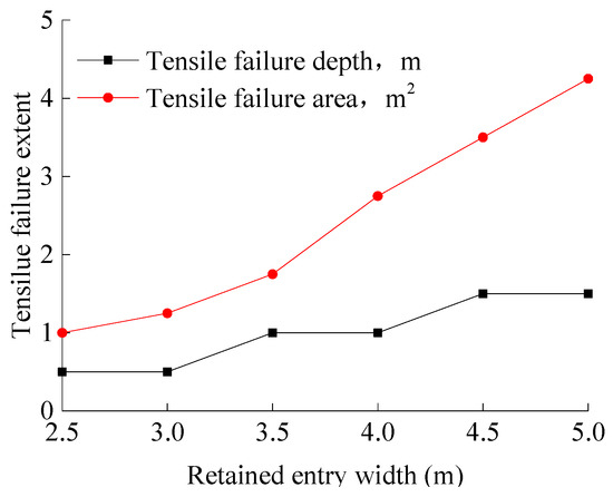 - When the retained entry width increases from 2.5 m to 4.5 m, the roof tensile failure depth increases from 0.5 m to 1.5 m while the roof tensile failure area increases from 1 m2 to 3.5 m2.