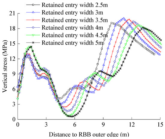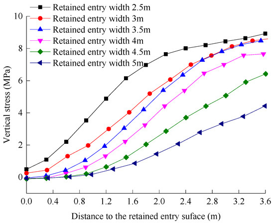 - Vertical stress of the immediate roof at the same depth decreases as the retained entry width increases. However, the stress relief zone increases for the surrounding rock at the same depth as the retained entry width increases. When the retained entry width is 3.5 m and 4.5 m, the depth of vertical stress below 4 MPa is 1.5 m and 3.5 m, respectively. Therefore, the larger the retained entry width, the more the vertical stress reduction and the greater the surrounding rock failure depth.