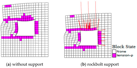 According to the numerical simulation results, Figure 13 shows the tensile failure distribution with respect to different support. It shows that the roof tensile failure depth around the RBB is greater than that around the solid coal rib. The maximum tensile failure depth is 3.5 m when there is no support to the entry. However, when the above mentioned support is employed, the tensile failure area and depth of the roof decreases evidently, especially the roof around the RBB. The maximum tensile failure depth of the roof is 1.0 m while that of the solid coal rib is 1.3 m, which is less than the rockbolt anchor depth. Hence, rockbolt support with anchor cables can reduce the tensile failure extent of the roof and the solid coal rib, and helps to stabilize the surrounding rock of GER-LMH with supercritical retained entry width.