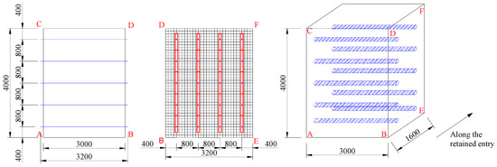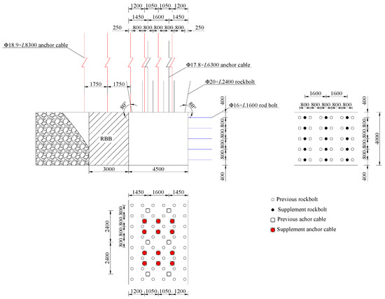 Both the rockbolt and anchor cable support are used to support the retained entry of 4211 panel. High-water quick consolidated filling materials and counter-pulled rockbolts are used to construct the RBB. The detailed support technique is as follows, and the designed support layout is shown in Figure 14.